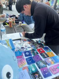 An attendee picks up a free copy of “Surviving College: Navigating Education and Mental Health” during the Surviving College Launch Event at Stanford University in April 2025. The event promoted mental health awareness in college and featured David Bradley’s brand, Big Head Bob. (Courtesy/David Bradley)