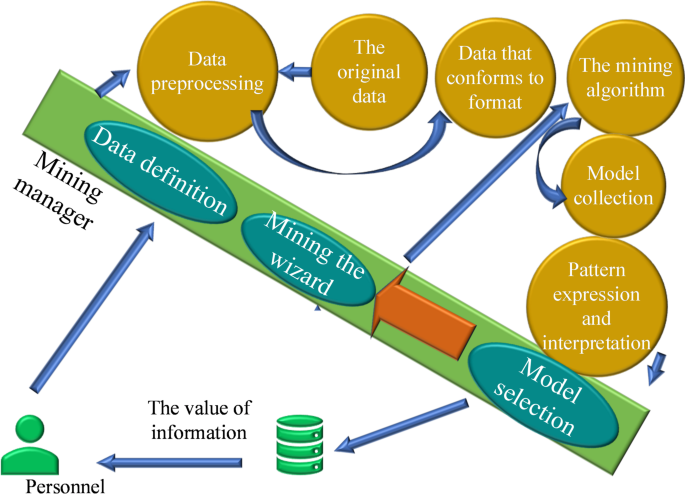 Data mining refers to the process of extracting meaningful information from large, incomplete, and noisy datasets17. With the rapid development of society and technology, data is now generated at an unprecedented rate, making it increasingly challenging to identify critical information within complex datasets18. As a method for managing, analyzing, and processing information, data mining plays a vital role in uncovering essential insights from massive amounts of data. The process typically involves filtering raw data to obtain relevant objects in a standardized format. These objects are then processed in the mining core to generate a set of patterns. Through further refinement, the system extracts valuable information, thereby completing the mining process19. The overall framework of the data mining process is illustrated in Fig. 1.